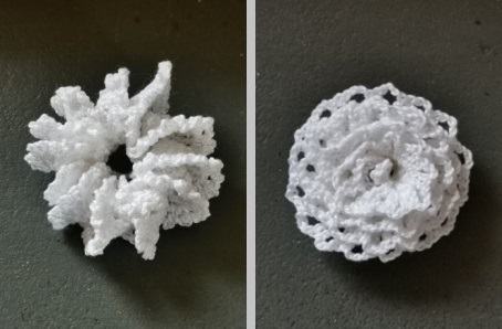 Elles sont amidonnées par ½ boule, sur une boule de polystyrène. Après 24h de séchage, les 2 demies sont cousues ensemble.